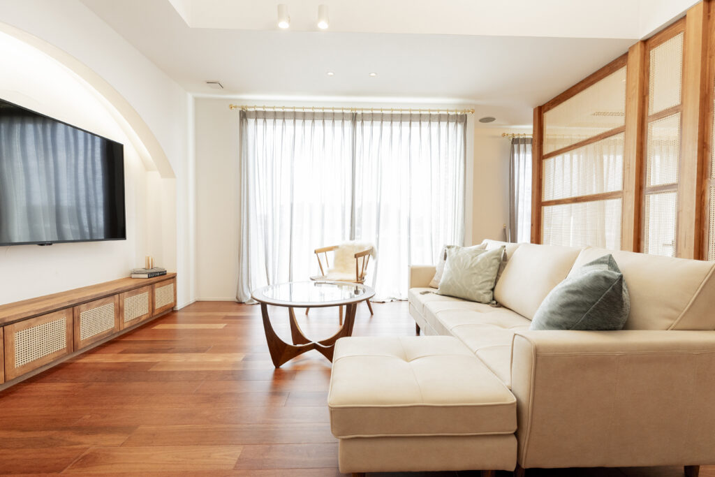大きな窓から差し込む自然光と、木の温もりを感じるフローリング。
