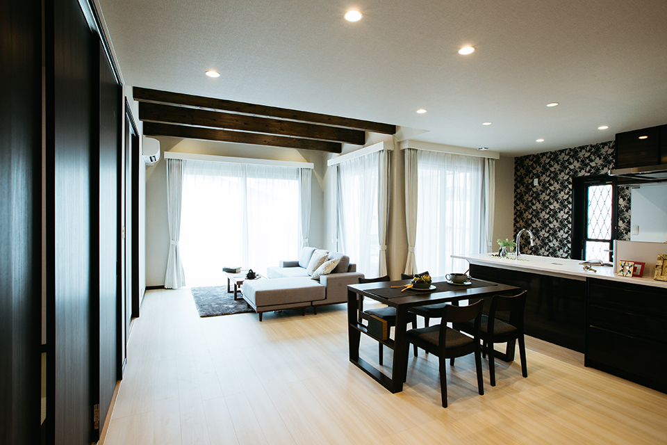 また、20.4帖のLDKは、アイランドキッチンを中心に一直線の生活動線になるように間取りを工夫しています。多数の窓から入る陽の光がリビングを優しく照らし、家族が自然と集まる暖かみ溢れる空間になっています。