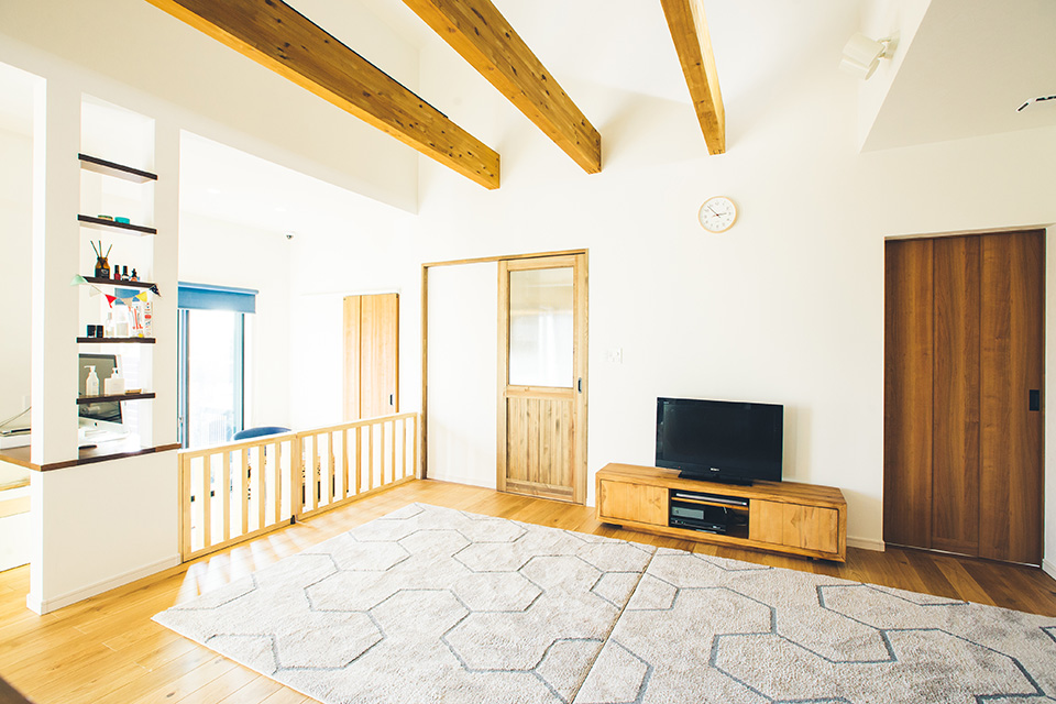 テレビスペースの背面にはウッドパネルを施工し、リビング入口のドアも「みうら」の無垢ドアを使用しています。暖かみのある無垢の木をふんだんに魅せたライジングらしい家づくりになっています。