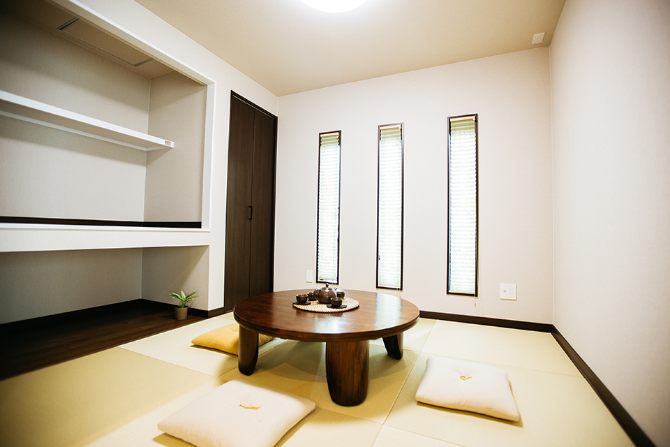 和室には真壁と自然素材の天井材を使用することで純和風の特別な空間に仕上げました。随所に設置された窓から、あたたかな光が降りそそぐ暮らしを想像させる「平屋みたいな2階建て」をご覧ください。