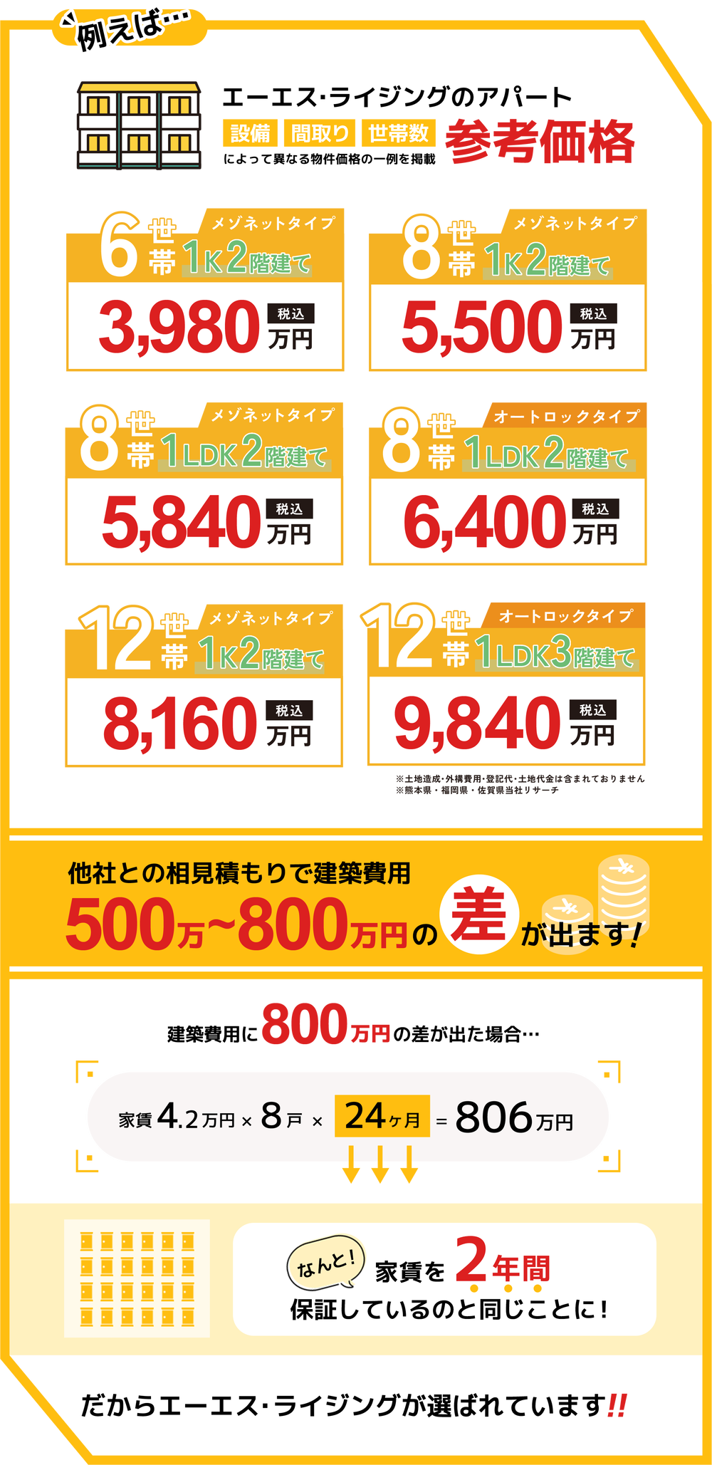 この最低800万円という差は、家賃4.2万円で8戸のアパートの場合、家賃2年分(806万円)に相当する金額です。つまり、エーエス・ライジングに建築を依頼して初期費用を抑えるということは、家賃2年分の保証を受けているのと同じことになるのです。